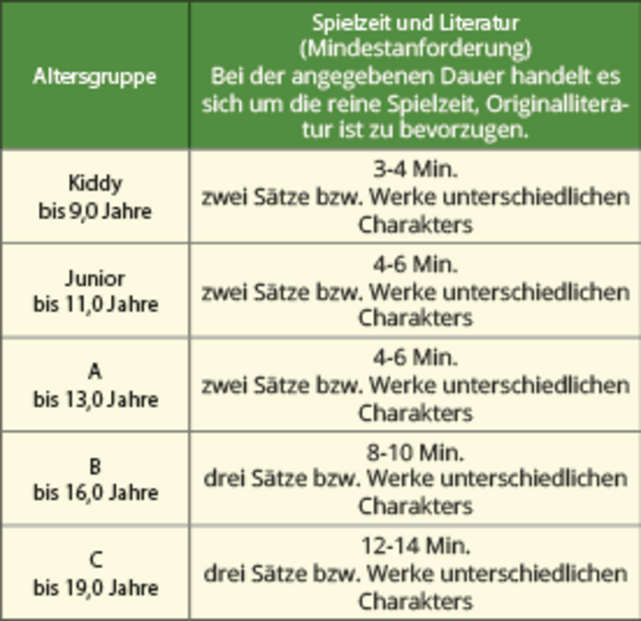 In allen Kategorien (außer Tasteninstrumente) ist auch ein Duo mit zusätzlichem Begleitinstrument (Klavier oder Zupfinstrument) möglich. Die Begleitung darf auch von einer Lehrperson übernommen werden.